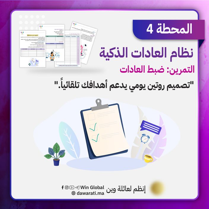 ⛔️صمم روتيناً يومياً يدعم أهدافك تلقائياً ويحول الفوضى إلى إنجاز مستمر. 📚في هذه الورشة تتعلم: ✅️تحليل الواقع: التعرف على عاداتك الحالية وفهم تأثيرها على طاقتك وعلاقاتك. ✅️هندسة البدائل: كيفية استبدال السلوكيات السلبية بعادات إيجابية تدعم نجاحك المهني والشخصي. ✅️بروتوكول الـ 21 يوماً: وضع خطة عملية لتثبيت العادات الجديدة لضمان الاستمرارية. 🤗انضم الآن لورشة نظام العادات الذكية، ابدأ بتصميم روتينك الجديد اليوم واصنع النجاح الذي تستحقه.