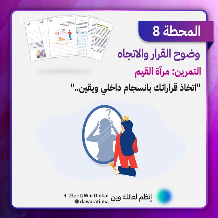 ⛔️اتخذ قراراتك بانسجام داخلي ويقين وتخلص من التشتت الذي يستنزف حياتك. 📚في هذه الورشة تتعلم: ✅️كشف القيم: التعرف على المبادئ الجوهرية التي تحرك حياتك وترتيب أولوياتك بدقة. ✅️القرار الواعي: فهم كيفية اختيار الاحتمالات بناءً على الوضوح العاطفي والنفسي. ✅️التوافق الذاتي: ربط قيمك بأهدافك اليومية لزيادة الثقة وتقليل القلق. 🤗انضم الآن لورشة وضوح القرار والاتجاه، كن واضحاً بشأن ما تريد واجعل حياتك أكثر قوة وسعادة.
